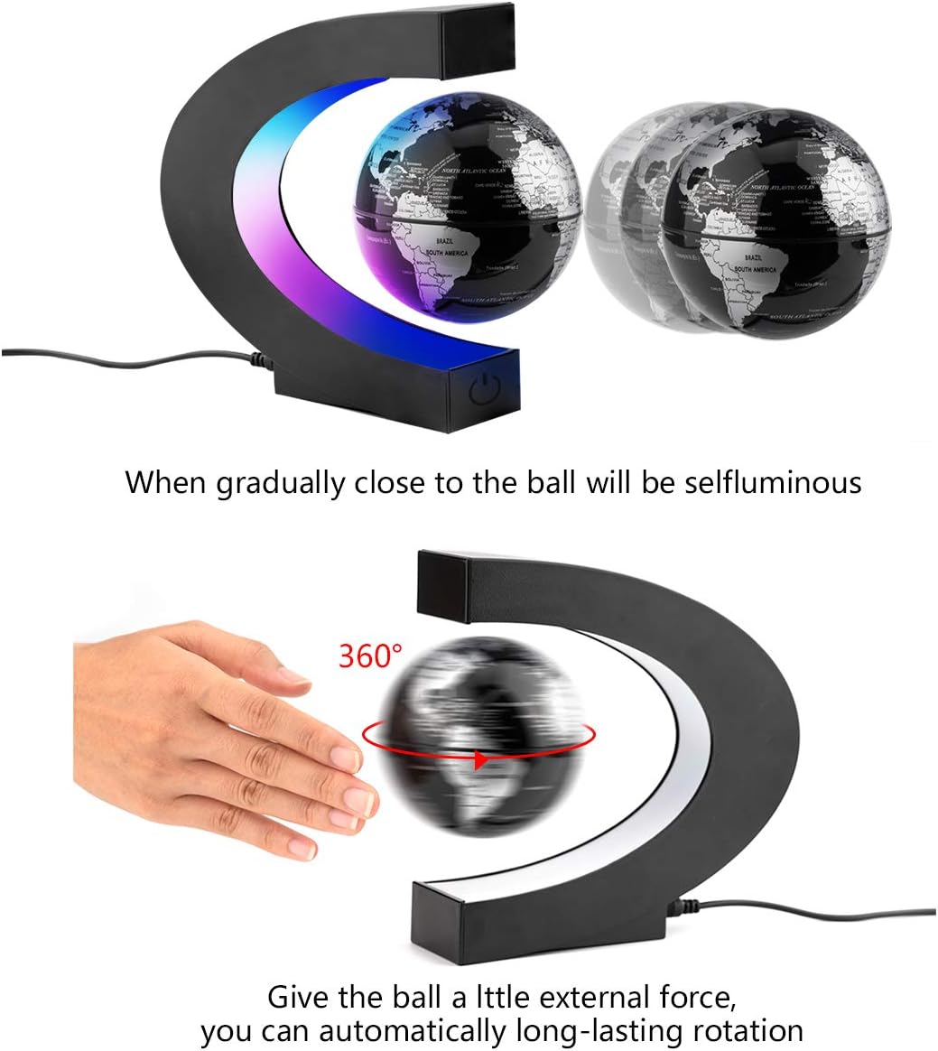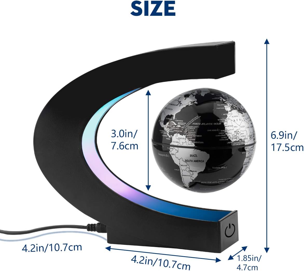 - Fácil de usar: Sostenga el globo con una mano y coloque el palo blanco en la parte superior de la base con la otra mano, asegúrese de que el polo norte esté en la parte superior. Solo haga girar el globo con sus dos manos y disfrútelo. Con la función de interruptor táctil que puede ayudarlo a apagar la luz del globo sin desconectar la alimentación, el globo sigue flotando.