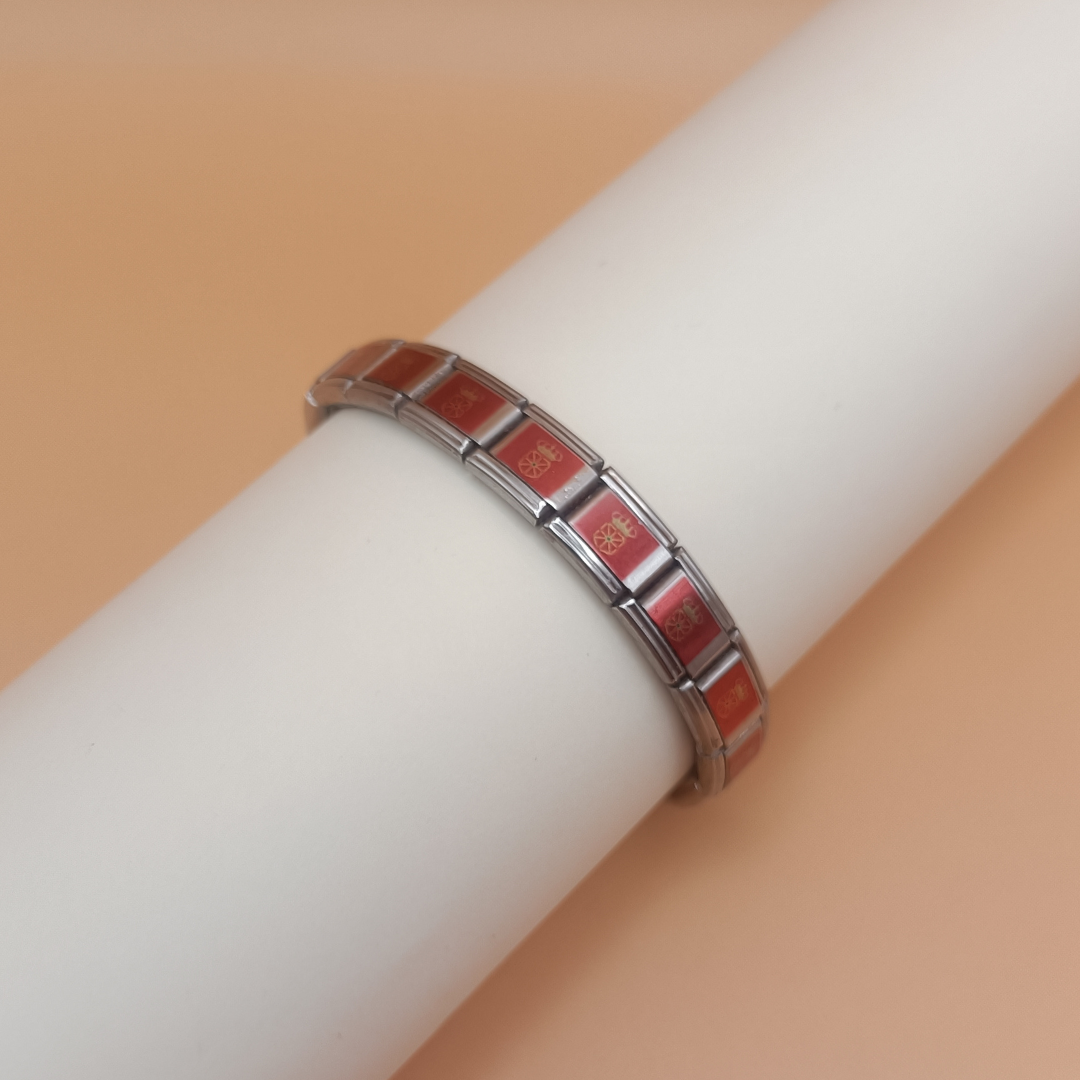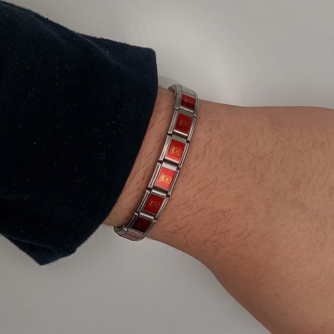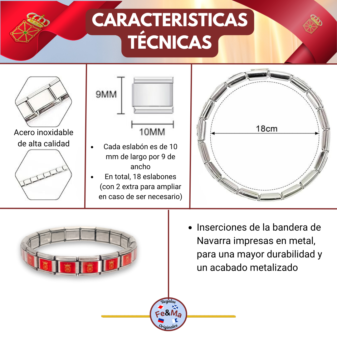 Con eslabones metálicos brillantes de acero inoxidable, esta pulsera está diseñada para durar y destacar. La bandera de Navarra ocupa ocho de los dieciocho eslabones que componen la pieza, creando un equilibrio visual que no pasa desapercibido. Además, incluye dos eslabones adicionales para facilitar el ajuste y asegurar la máxima comodidad.