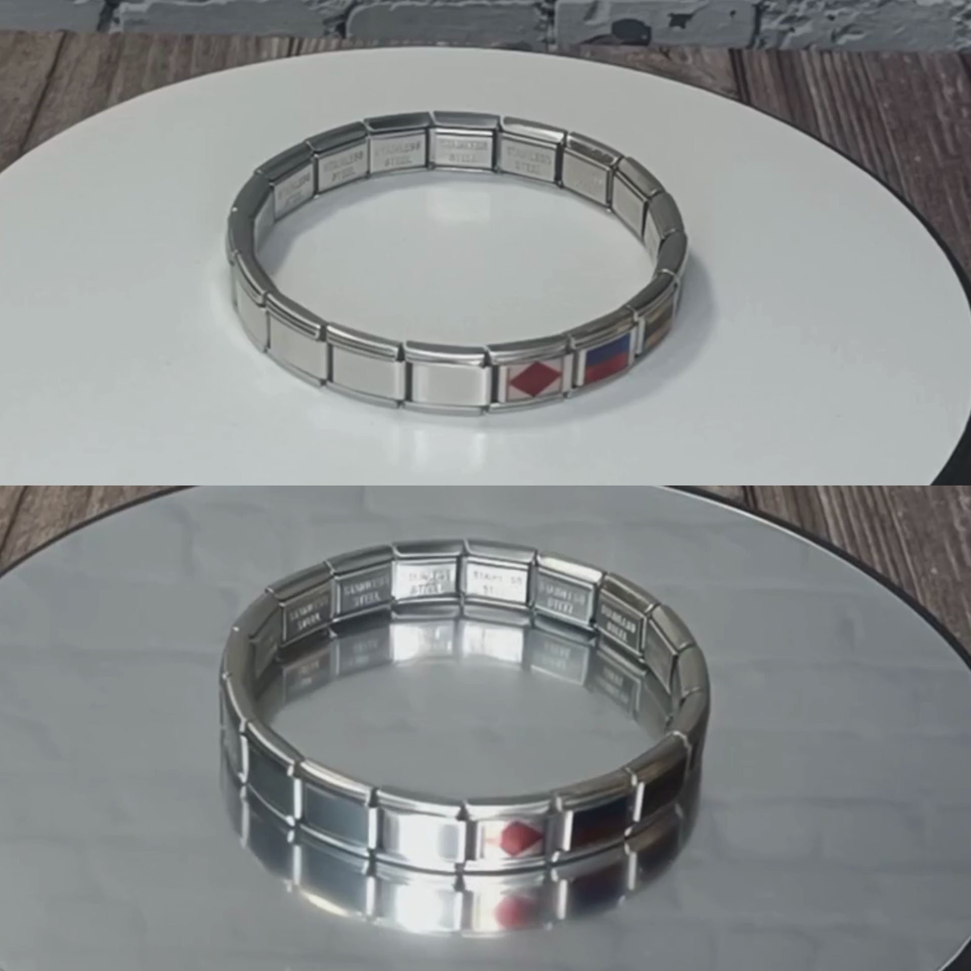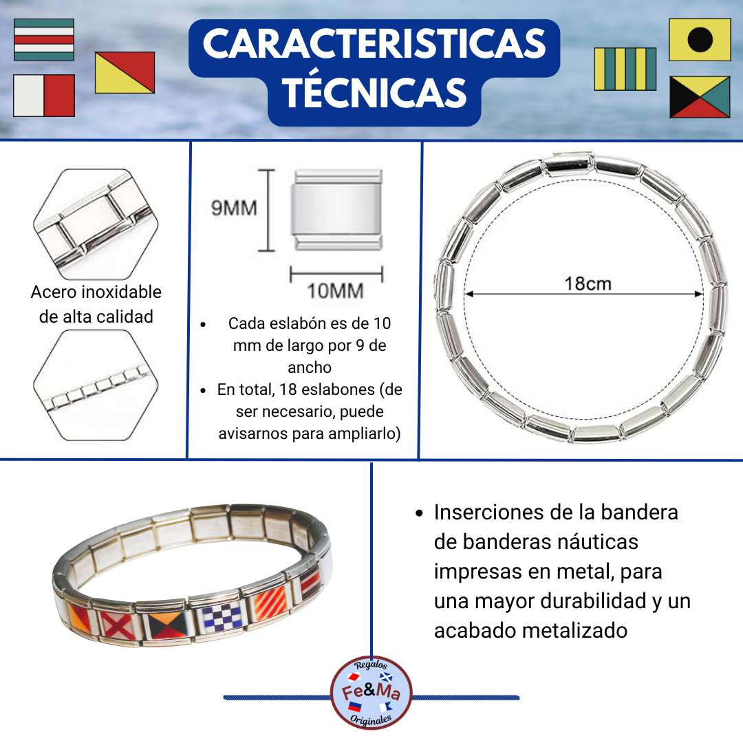 Calidad premium y diseño elegante: Fabricada en acero inoxidable de alta calidad, esta pulsera es resistente, brillante y duradera. Las banderas náuticas están sublimadas directamente sobre el metal, asegurando colores vivos y detalles precisos que no se despegan ni se desgastan.